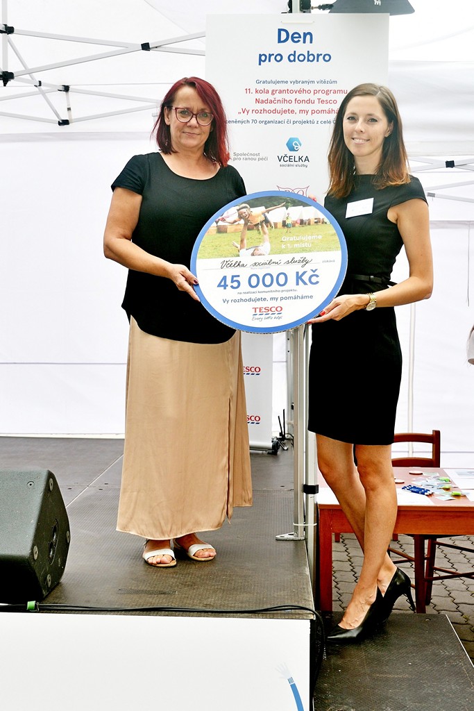Nadační dar bude použit na spolufinancování pronájmu vozidla, kterým naše včelky jezdí za svými klienty do jejich domovů. Šek v hodnotě 45 000 Kč převzala naše regionální ředitelka Eva Vojtová z rukou generální ředitelky Tesco Kataríny Navrátilové při příležitosti Dne pomoci v pražském Edenu.