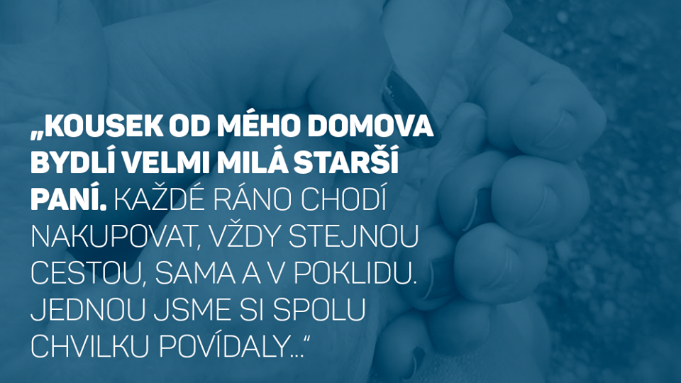 "Kousek od mého domova bydlí velmi milá starší paní. Každé ráno chodí nakupovat, vždy stejnou cestou, sama a v poklidu. Jednou jsme si spolu chvilku povídaly a paní mne zaujala, že i ve svém věku má přehled o dění ve svém okolí a ve světě. Rok se s rokem sešel a náhle telefon s prosbou, zda bychom mohly poskytnou osobní asistenci mamince. Nic těžkého, spíše si s ní popovídat, aby nebyla pořád sama. Jela jsem na šetření a hle, ona to ta milá paní.